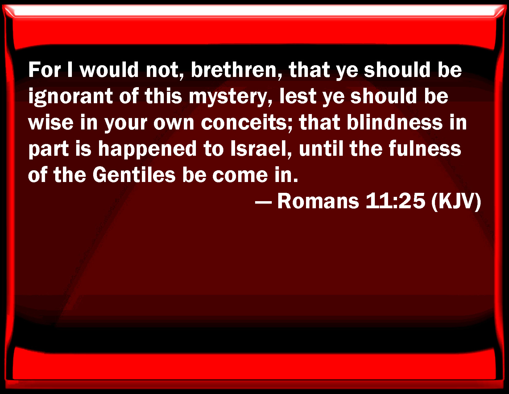 Rom 11:25 For I would not, brethren, that ye should be ignorant of this mystery, lest ye should be wise in your own conceits; that blindness in part is happened to Israel, until the fulness of the Gentiles be come in.